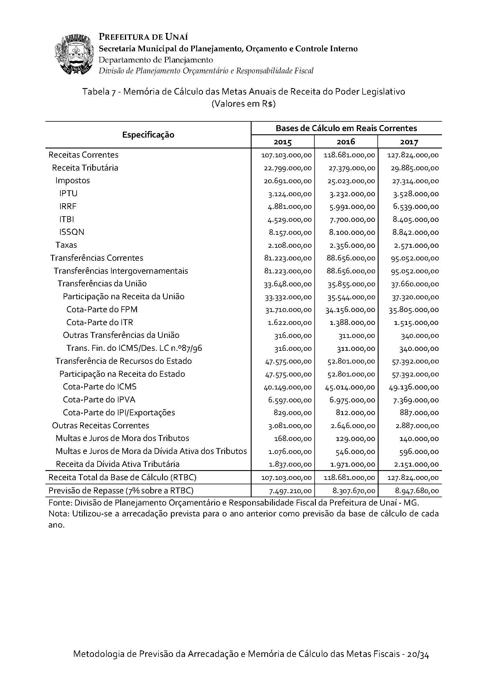 O projeto de lei orçamentária anual de 2015 deverá incluir as receitas e contribuições, conforme Consulta n.º 838.450, de 29 de fevereiro de 2012, do Tribunal de Contas do Estado de Minas Gerais – TCEMG –, na base de cálculo do limite de despesas do Poder Legislativo.