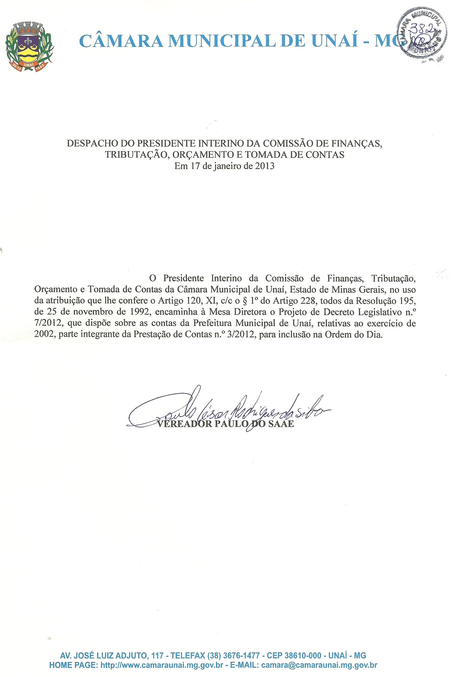 | Inclusão na Ordem do Dia | Despacho | 17/01/2013 | Vereador Paulo do Saae | 7749.jpeg |