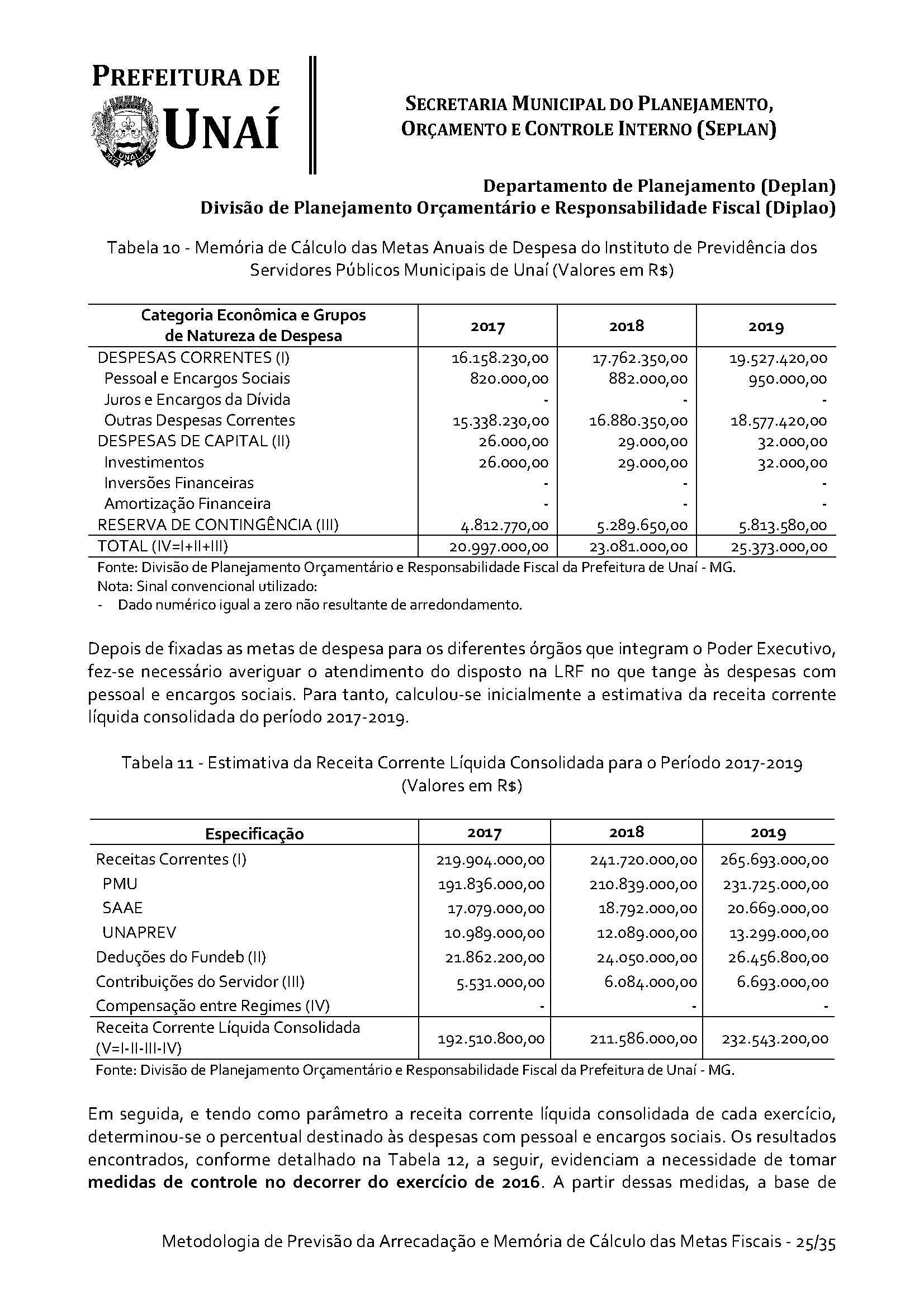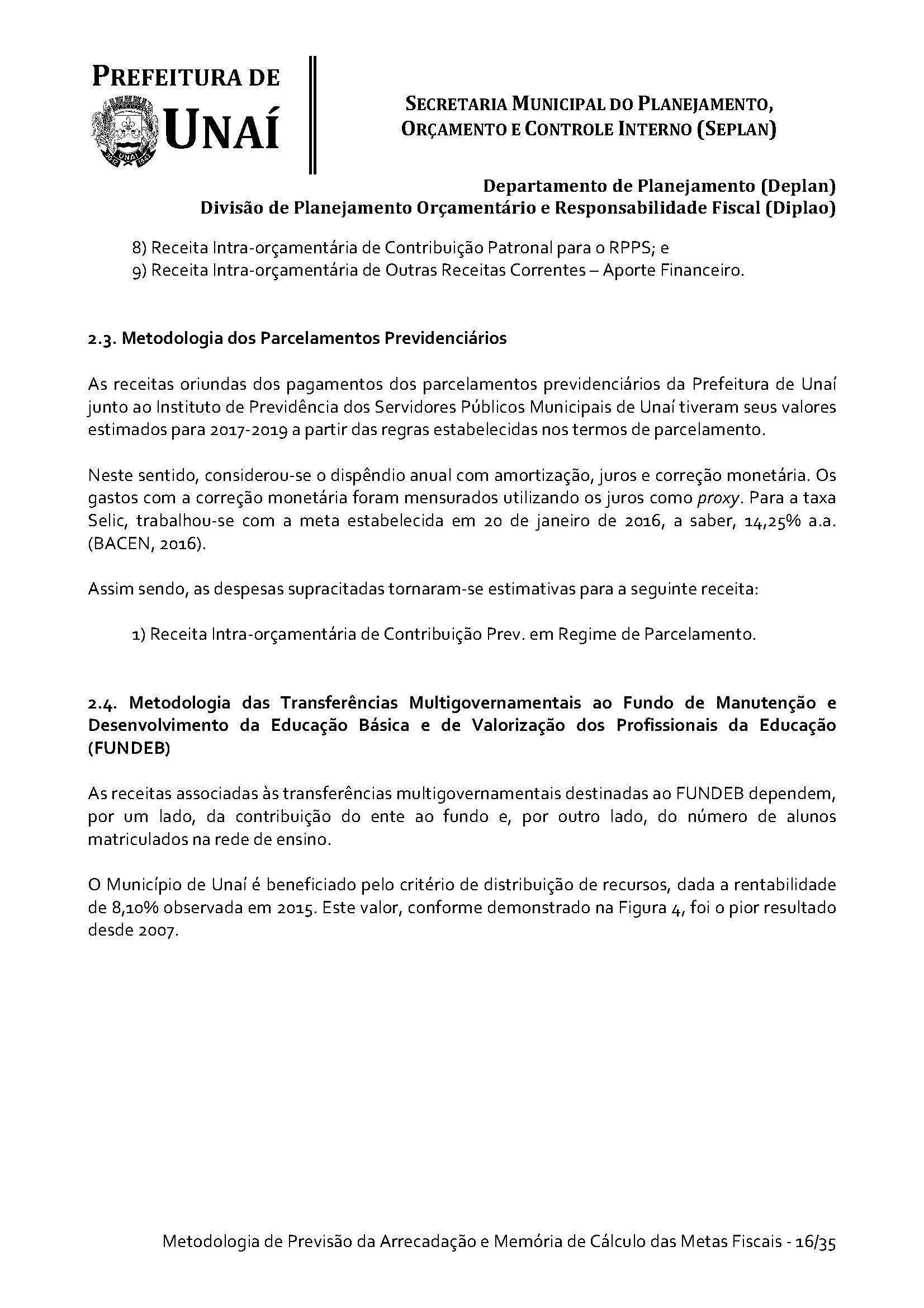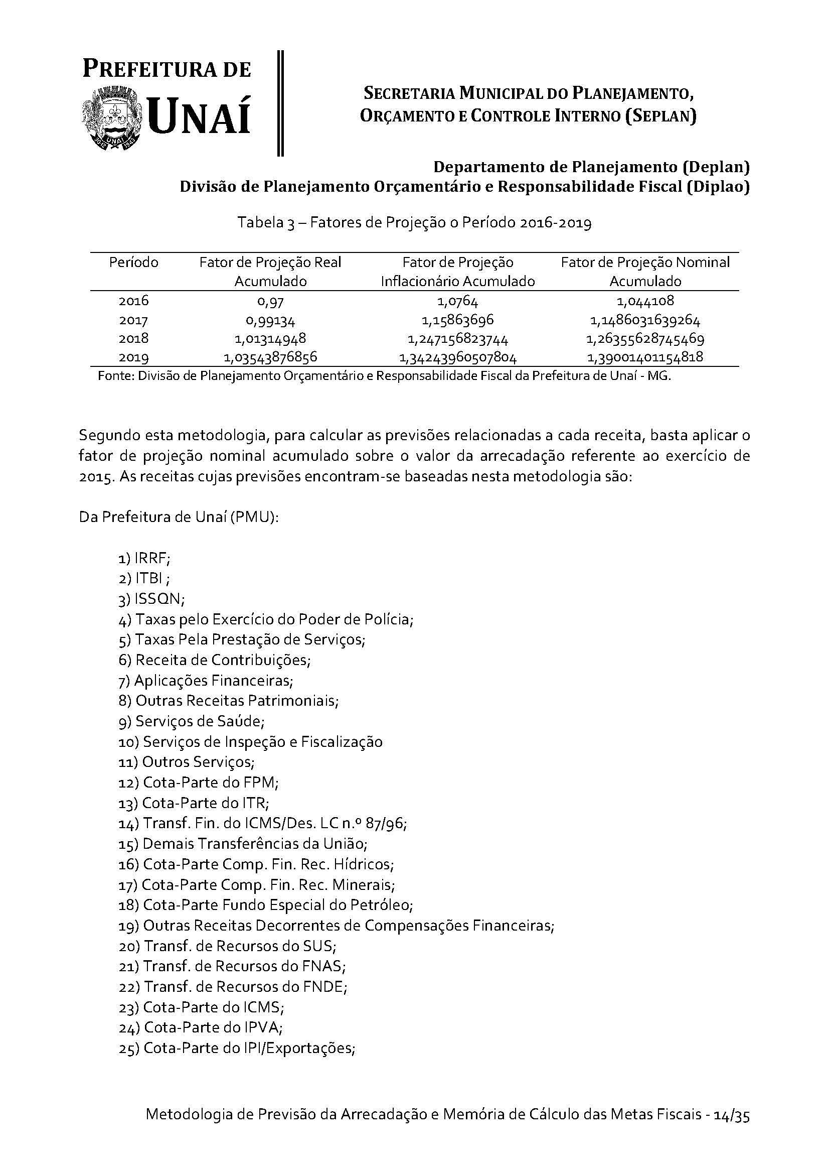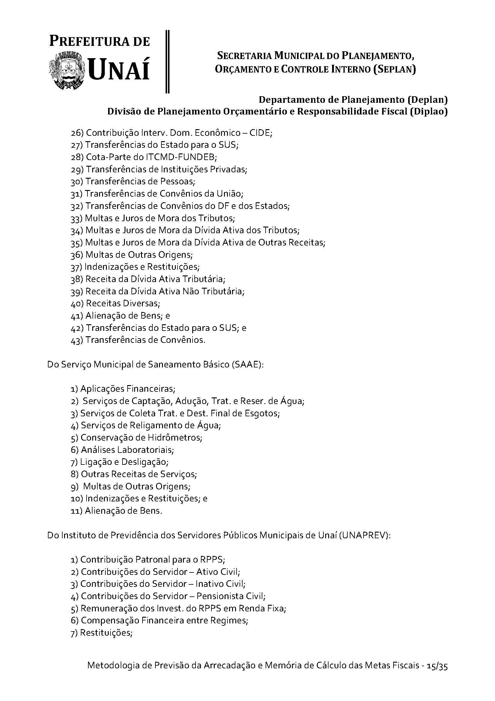 Os órgãos da Administração Indireta do Poder Executivo e o Poder Legislativo, se for o caso, encaminharão à Divisão de Planejamento Orçamentário e Responsabilidade Fiscal da Secretaria Municipal do Planejamento, Orçamento e Controle Interno da Prefeitura de Unaí, até 15 (quinze) dias antes do prazo definido no caput deste artigo, os estudos e estimativas das suas receitas orçamentárias para o exercício subsequente e as respectivas memórias de cálculo, para fins de consolidação da receita municipal.