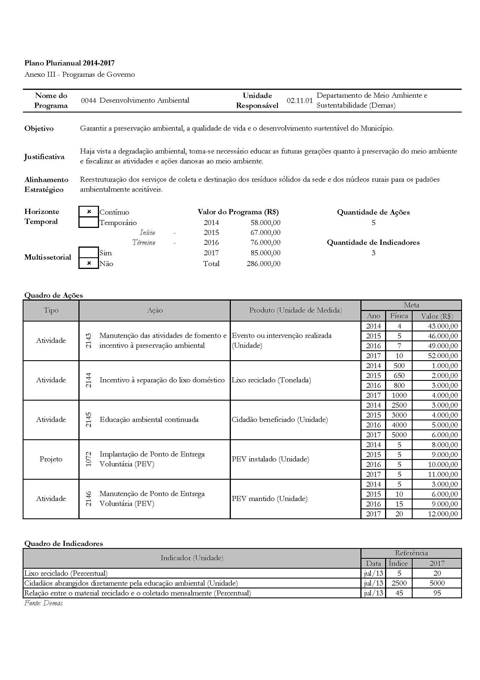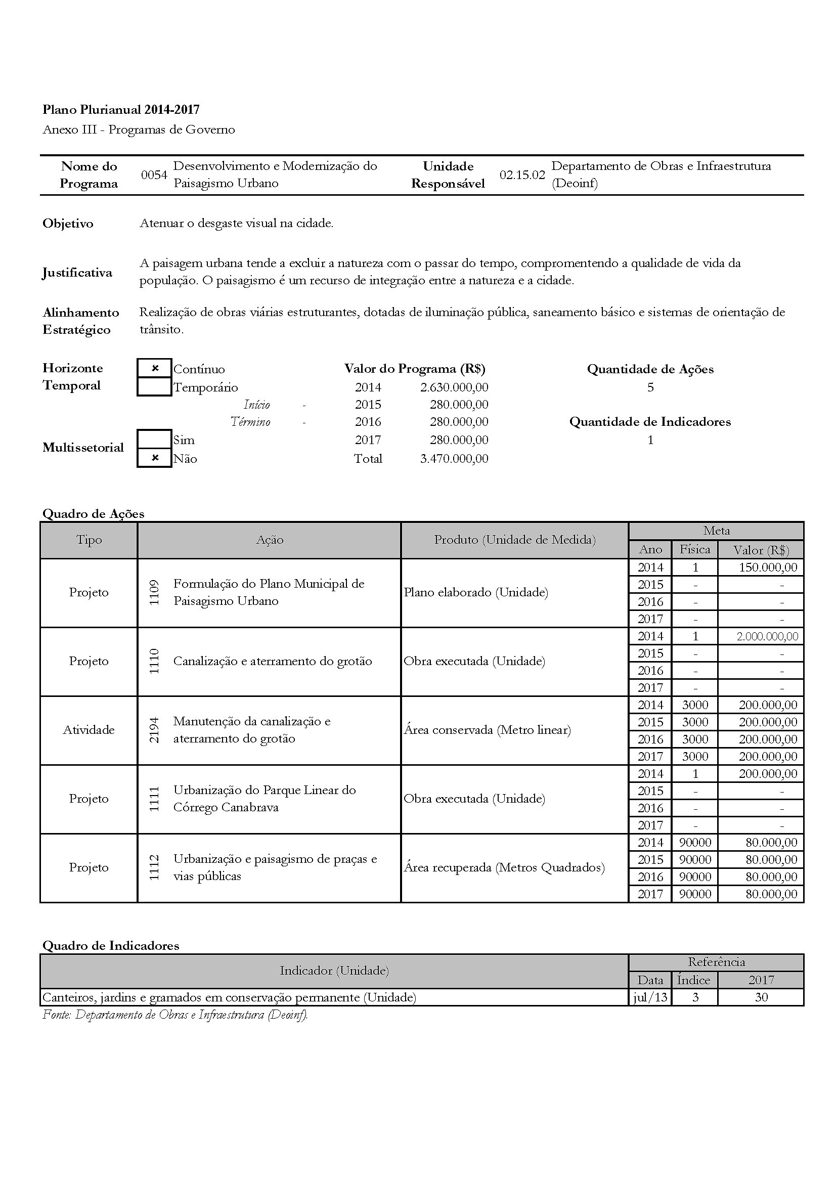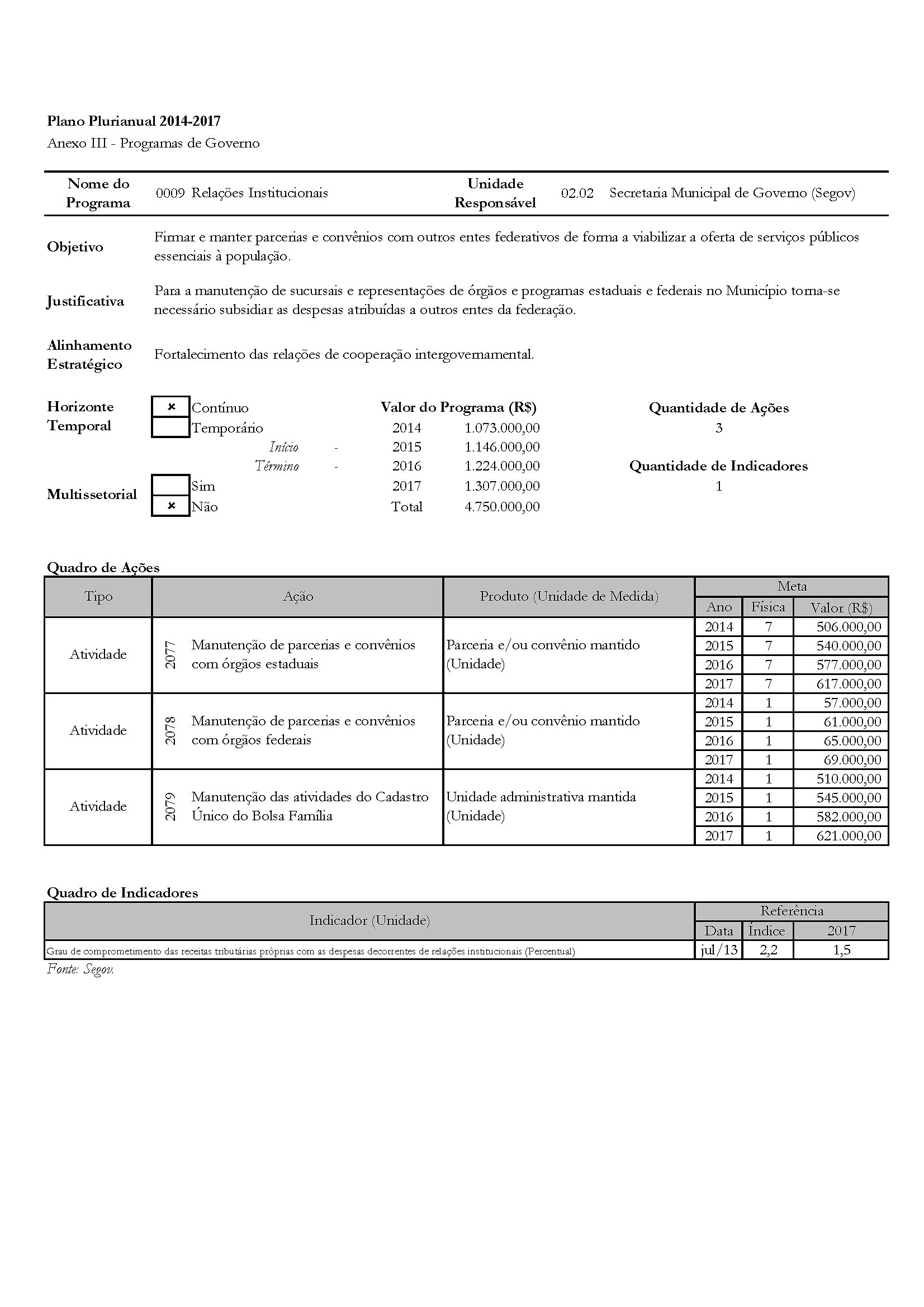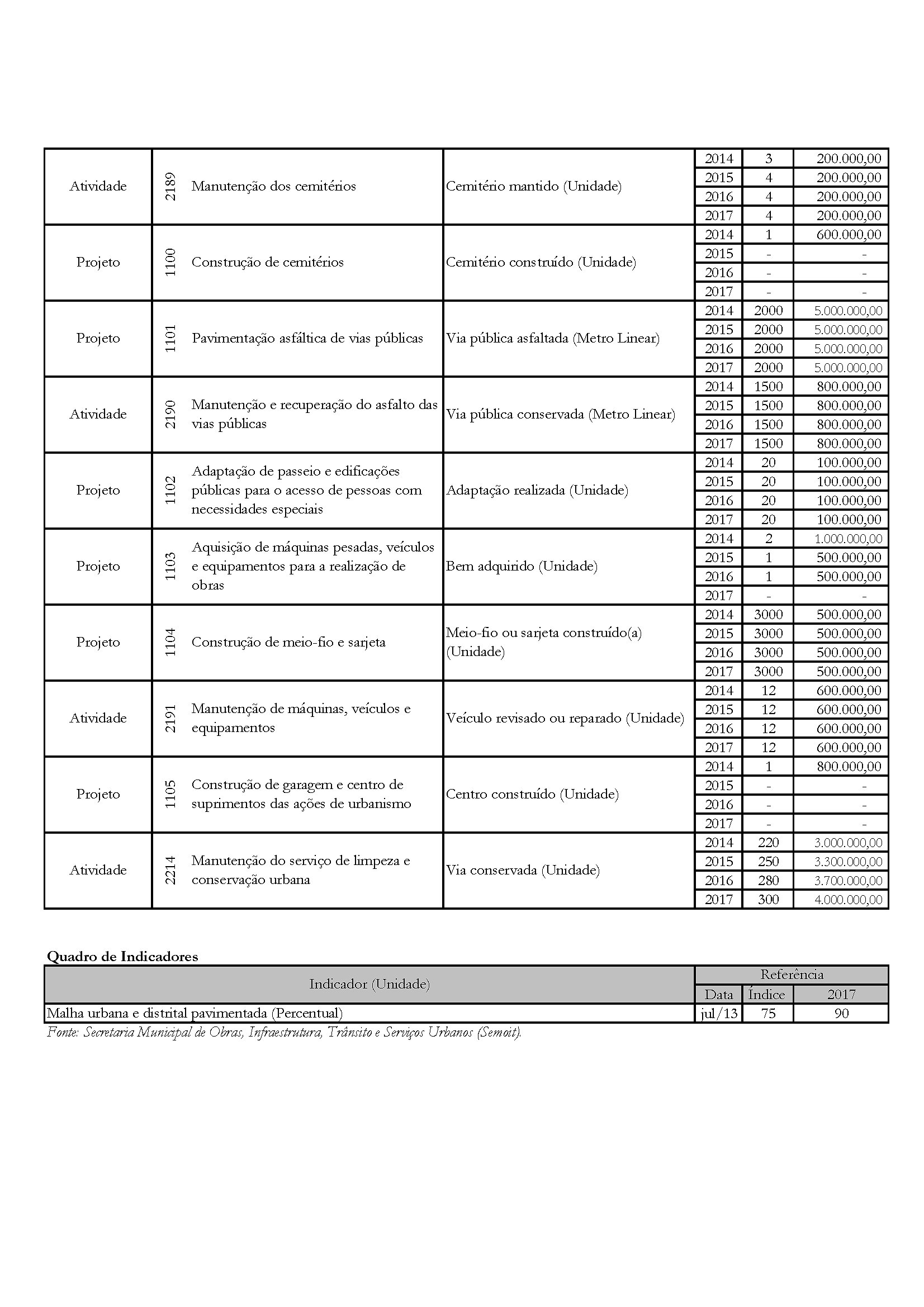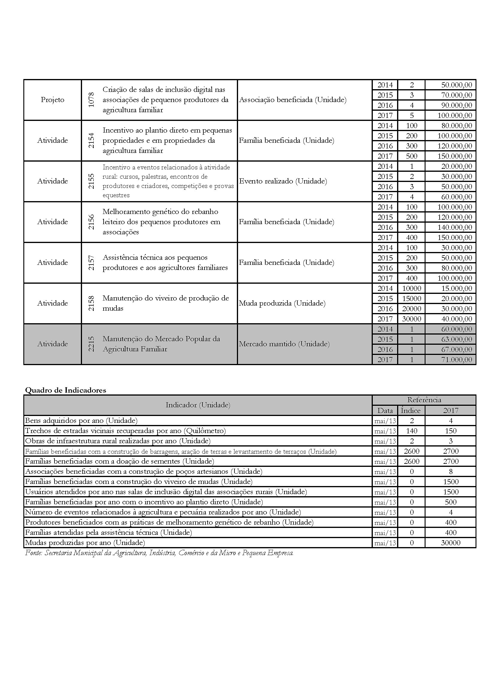 O Plano Plurianual para o quadriênio 2014-2017, em cumprimento ao disposto no artigo 165, § 1º da Constituição Federal e no artigo 157 da Lei Orgânica do Município, reger-se-á por esta Lei, estabelecendo, para o período, os programas com seus respectivos objetivos, indicadores e custos da Administração Municipal, para as despesas de capital e outras delas decorrentes e para as relativas aos programas de duração continuada.