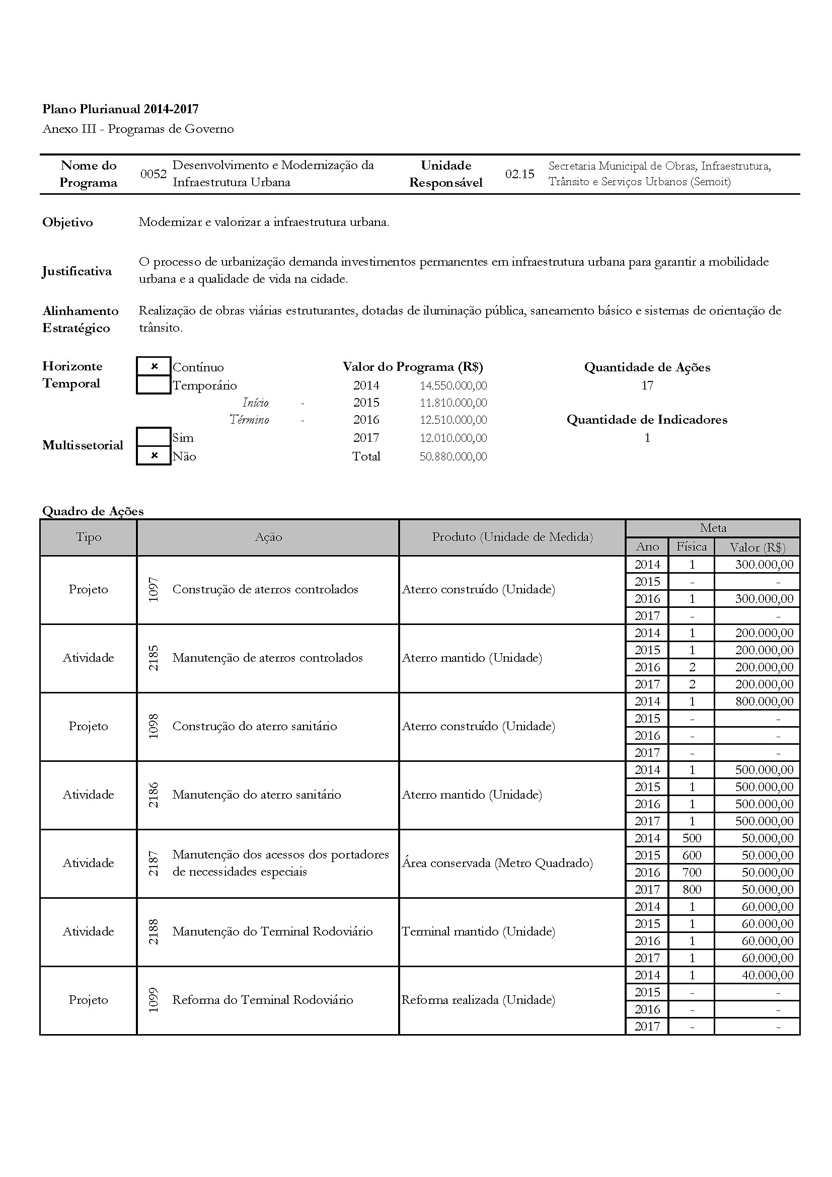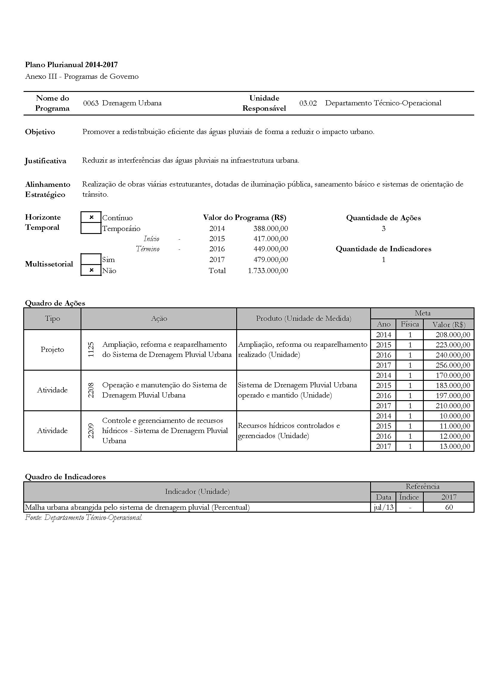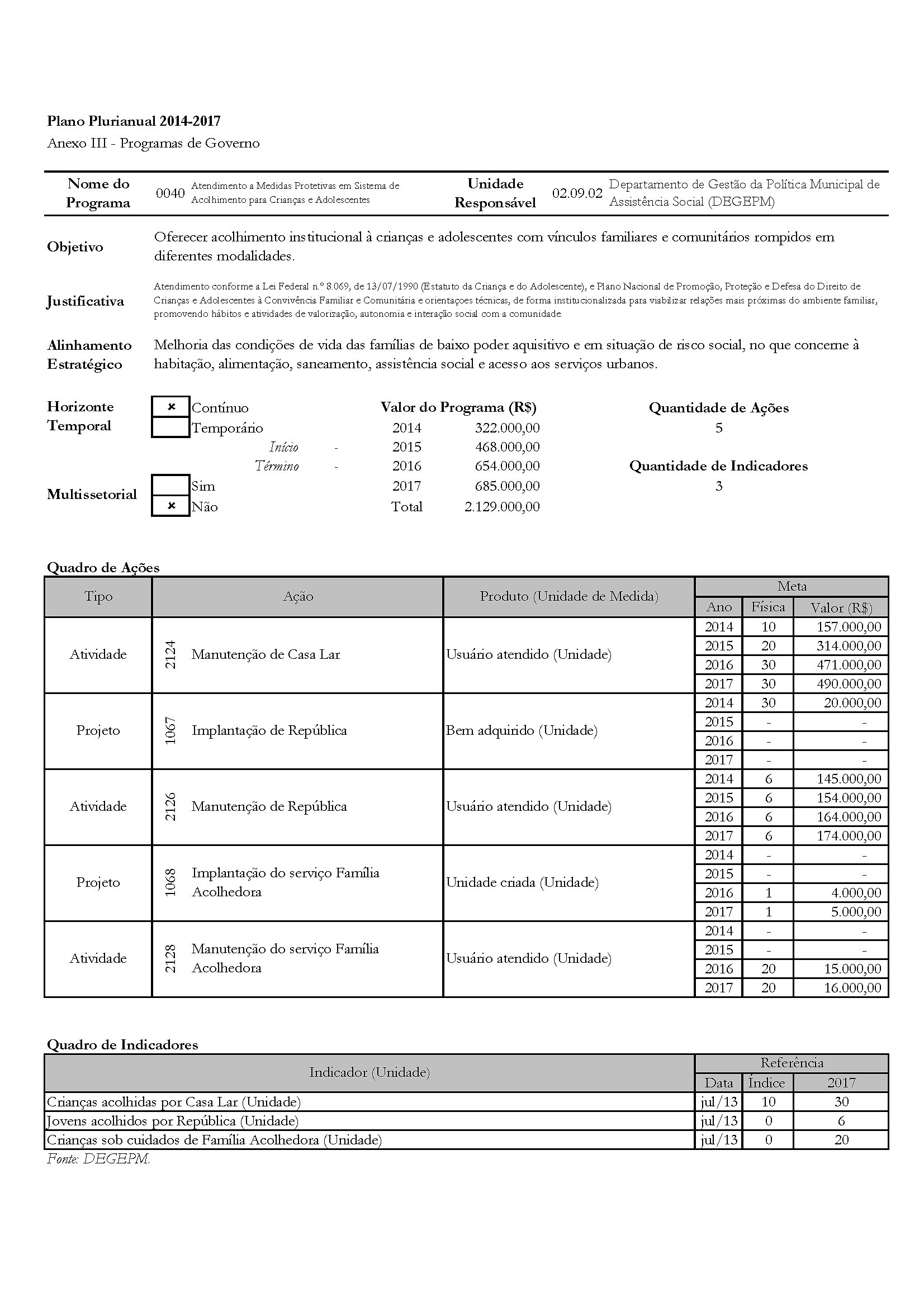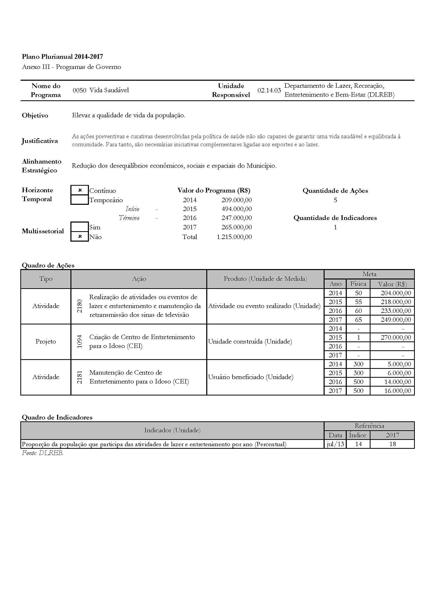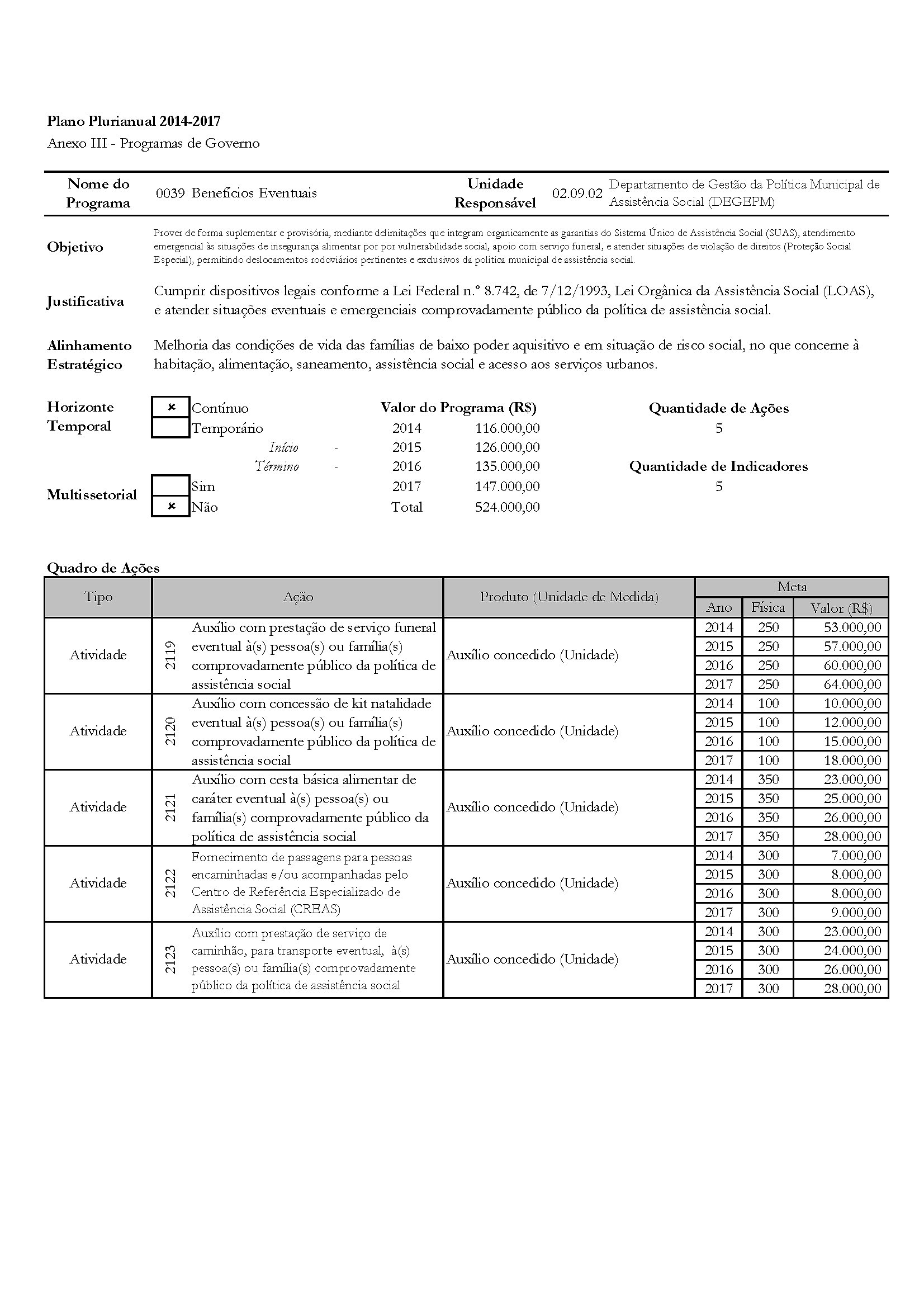 O Plano Plurianual para o quadriênio 2014-2017, em cumprimento ao disposto no artigo 165, § 1º da Constituição Federal e no artigo 157 da Lei Orgânica do Município, reger-se-á por esta Lei, estabelecendo, para o período, os programas com seus respectivos objetivos, indicadores e custos da Administração Municipal, para as despesas de capital e outras delas decorrentes e para as relativas aos programas de duração continuada.